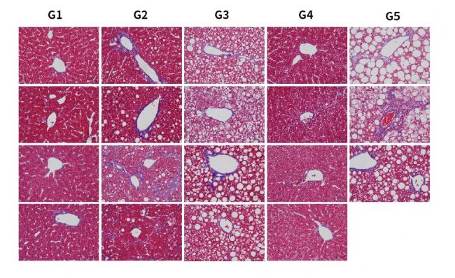 圖8. HSD誘導6周后各組小鼠Masson染色代表圖。結果顯示,HSD飲食誘導下,肝臟特異性過表達hPNPLA3 I148M小鼠出現明顯纖維化(G3,G5)。