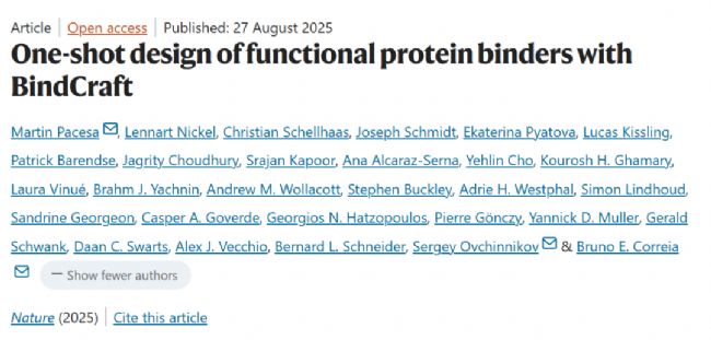 近期,EPFL×MIT團隊在《Nature》發表的題為“One-shot design of functional protein binders with BindCraft”的研究,提出了一款名為BindCraft的開源自動化設計流程,徹底改變了這一局面。該工具以AlphaFold2(AF2)為核心驅動,無需高通量篩選或實驗優化,就能從頭設計出納米摩爾級親和力的蛋白質結合劑,實驗成功率高達10%~100%,即便在未知結合位點的情況下仍能高效工作。