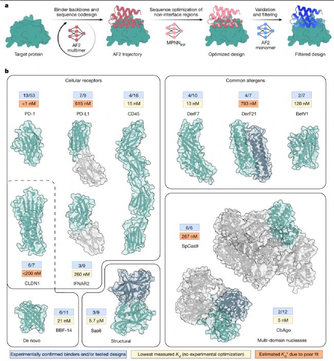 一款蛋白質設計工具的價值,最終需通過實驗驗證其普適性與功能性。BindCraft團隊選擇了12類具有重要生物學與治療意義的靶標進行測試,涵蓋細胞表面受體、常見過敏原、從頭設計蛋白及多結構域核酸酶(如CRISPR-Cas9),每類靶標的設計結果都令人驚喜。