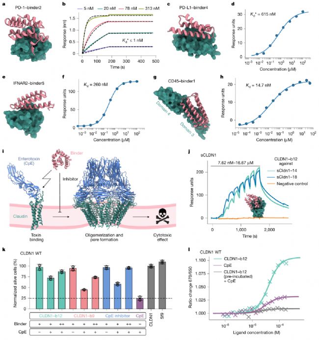更值得關注的是,BindCraft對“無已知結合位點”靶標的設計能力。以CD45為例,其胞外域含4個免疫球蛋白樣結構域且高度糖基化,傳統方法難以定位結合位點。BindCraft設計的16個結合劑中,4個通過SPR驗證,最優結合劑(binder1)親和力達14.7 nM,且精準靶向d3與d4結構域的連接區域——這一結果證明,BindCraft無需依賴已知結合位點信息,僅通過靶標結構即可“自主”發現功能性結合區域,為難成藥受體的靶向提供了新策略。