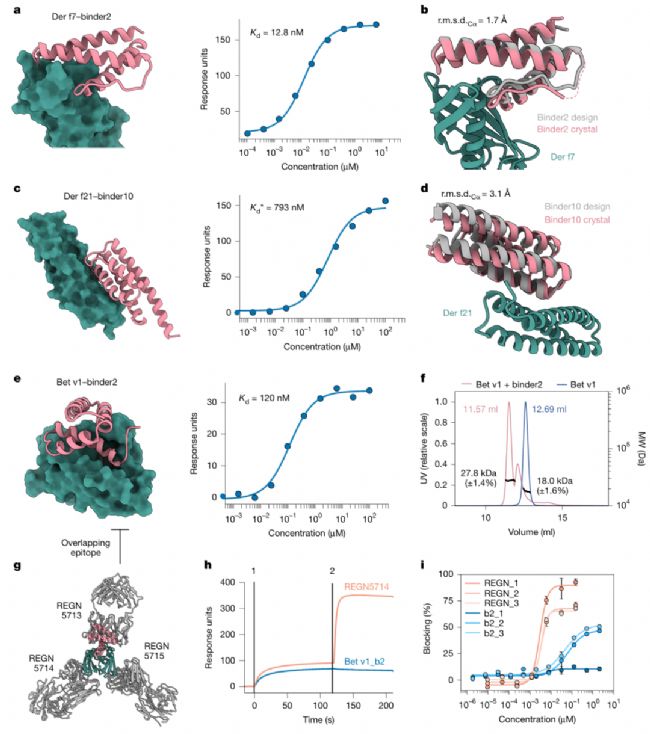 針對Bet v1,BindCraft設計的7個結合劑中2個有效,最優結合劑(binder2)親和力達120 nM,且能與臨床候選抗體混合物(REGN5713/5714/5715)競爭相同表位。更關鍵的是,在患者血清樣本中,該結合劑能阻斷Bet v1與IgE的結合,最高阻斷率達50%——這一結果與單克隆抗體的阻斷效果相當,且結合劑穩定性更高,為過敏性疾病的“精準中和”提供了新方案。此外,針對Der f7的結合劑(binder2)還通過晶體結構驗證,其backbone與設計模型的RMSD僅1.7 Å,證明了BindCraft設計的結構準確性。