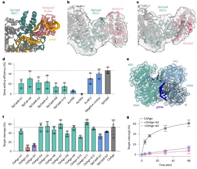 在SpCas9(CRISPR基因編輯核心工具)的設計中,BindCraft靶向其REC1結構域(向導RNA結合口袋),6個測試結合劑全部能結合全長apo SpCas9,最優結合劑(binder3/10)親和力達300 nM級。功能實驗顯示,這些結合劑能顯著降低HEK293T細胞中的Cas9基因編輯效率,且抑制效果優于天然抗CRISPR蛋白AcrIIC2——這為基因編輯的“精準調控”提供了新工具,可有效降低脫靶效應。
