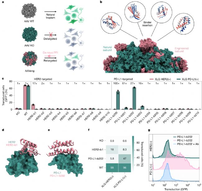 實驗結果顯示,針對HER2設計的結合劑(binder1)與PD-L1設計的結合劑(binder202),能使AAV特異性靶向表達HER2或PD-L1的HEK293細胞, transduction效率最高提升61倍,且當加入靶向PD-L1的抗體后,transduction被顯著阻斷——證明結合劑確實介導了AAV與靶標受體的特異性結合。這一成果為基因治療的“精準遞送”提供了新策略,可實現對疾病相關細胞的定向基因導入,降低系統毒性。
