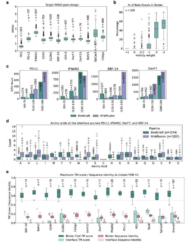 值得注意的是,BindCraft還解決了傳統設計的另一大局限——靶標結構的“剛性依賴”。此前如RFdiffusion等方法需固定靶標backbone,而BindCraft在每輪設計迭代中都會重新預測結合劑-靶標復合物結構,允許靶標與結合劑的側鏈和backbone存在一定靈活性(靶標backbone的Cα RMSD可在0.5~5.5 Å范圍內調整),最終形成的結合界面能更精準地“貼合”靶標結合位點,這也是其能在未知結合位點場景下工作的關鍵。