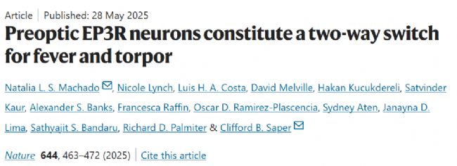 2025年5月28日,美國、巴西以及意大利學者聯合在Nature期刊上發表了題名為“Preoptic EP3R neurons constitute a two-way switch for fever and torpor”的研究論文,研究揭示了前視下丘腦正中核(MnPO)中表達前列腺素EP3受體(EP3R)的神經元群體在體溫調節中的核心作用。