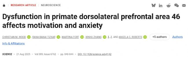 2025年8月21日,英國學者在Science期刊上發表了題名為“Dysfunction in primate dorsolateral prefrontal area 46 affects motivation and anxiety”的研究論文,研究揭示了獼猴背外側前額葉皮層(dlPFC)區域46在情緒調節中的因果作用及神經機制。