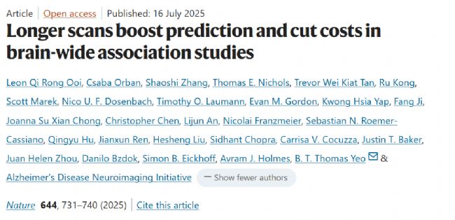 2025年7月16日,多個國家包括新加坡、英國、美國、中國、德國、加拿大以及澳大利亞的學者聯合在Nature期刊上發表了題名為“Longer scans boost prediction and cut costs in brain-wide association studies”的研究論文,研究通過理論建模和九大靜息/任務態fMRI數據集(涵蓋76種表型)的系統分析,揭示了全腦關聯研究(BWAS)中掃描時長與樣本量對表型預測精度的聯合影響。