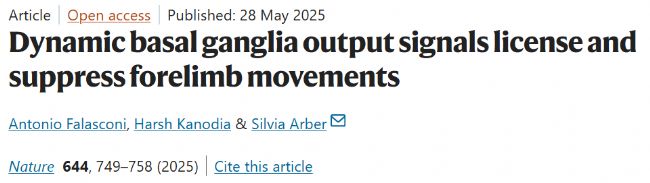 2025年5月28日,瑞士以及美國的學者聯合在Nature期刊上發表了題名為“Dynamic basal ganglia output signals license and suppress forelimb movements”的研究論文,研究通過對小鼠黑質網狀部(SNr)基底節輸出神經元的研究,揭示了其在精細前肢運動控制中的動態編碼機制。