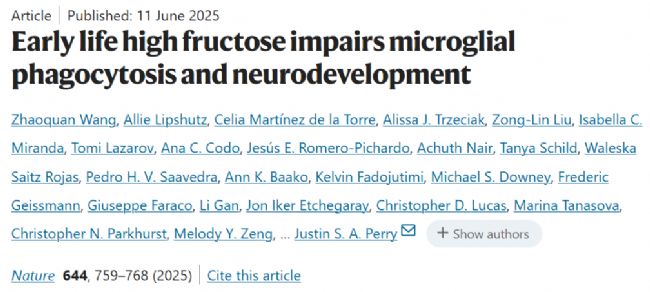 2025年6月11日,美國以及英國的學者聯合在Nature期刊上發表了題名為“Early life high fructose impairs microglial phagocytosis and neurodevelopment”的研究論文,研究揭示了生命早期高果糖攝入通過影響小膠質細胞功能進而損害神經發育的機制。
