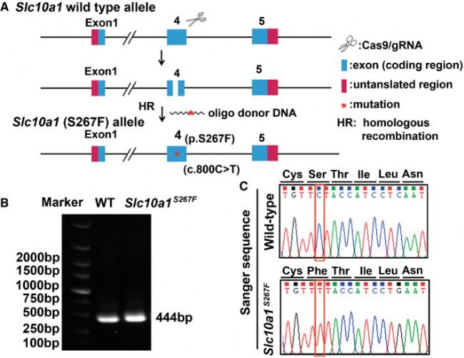 為了尋找潛在的致病基因,研究團(tuán)隊(duì)利用全基因組重測(cè)序(WGS)聯(lián)合生物信息學(xué)技術(shù)對(duì)患者及其家系成員進(jìn)行了分析。結(jié)果顯示,已知的PFIC基因內(nèi)均未檢測(cè)到突變。然而,在NTCP/SLC10A1基因內(nèi)發(fā)現(xiàn)了一個(gè)p.S267F純合子突變。NTCP是肝細(xì)胞基底外側(cè)膜膽汁酸攝取轉(zhuǎn)運(yùn)體,其功能缺失突變(p.R252H)可導(dǎo)致無(wú)肝損傷的高膽血癥。但令人驚訝的是,Slc10a1S267F純合突變小鼠并未表現(xiàn)出肝損傷和高膽血癥的癥狀,這表明患兒的肝功能異常可能另有原因。