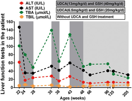 面對(duì)這一新型PFIC患者,研究團(tuán)隊(duì)在發(fā)病機(jī)制的基礎(chǔ)上,嘗試制定了針對(duì)性的治療方案。他們給予患兒UDCA(熊去氧膽酸)和GSH(谷胱甘肽)作為經(jīng)驗(yàn)治療。UDCA是一種常用的膽汁酸螯合劑,能夠增加膽汁酸的溶解度并促進(jìn)其排泄;而GSH則是一種重要的抗氧化劑,能夠保護(hù)肝細(xì)胞免受氧化應(yīng)激損傷。