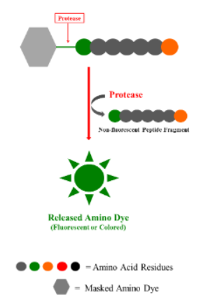 圖1.半胱天冬酶敏感的肽片段掩蔽氨基染料后被半胱天冬酶消化以產生高度熒光染料。熒光強度增加與半胱天冬酶活性成正比。
