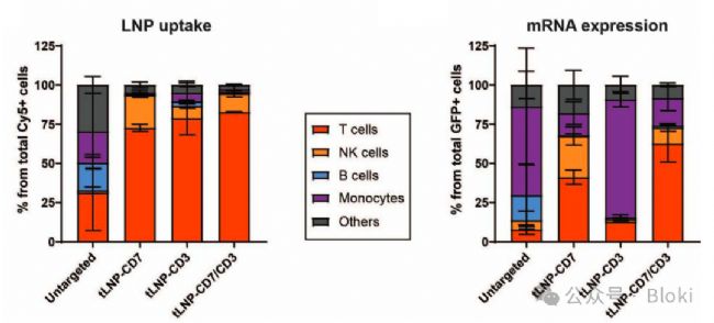 體外,LNP作用在PBMC上,看哪些細胞攝取、表達了LNP中的貨物,發現CD7、CD3兩種抗體修飾更利于靶向T細胞,驅動貨物表達