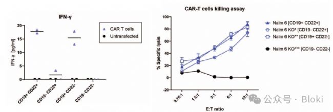 又做了CD19、CD22雙靶點CAR-T,體外響應靶細胞分泌IFNr、殺靶細胞