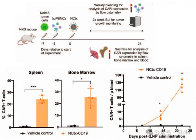 體內實現雙靶點CAR-T制備(作者沒提供他的LNP遞送CAR mRNA體內制備CAR-T效果的數據,只是引用文獻數據對比,說自己的LNP+mcDNA更能持久的體內制備CAR-T)