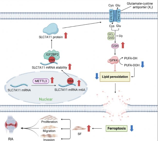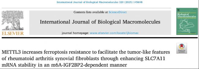 Xu Y, Liu W, Zai Z, Qian X, Hu W, Peng X, Chen F. METTL3 increases ferroptosis resistance to facilitate the tumor-like features of rheumatoid arthritis synovial fibroblasts through enhancing SLC7A11 mRNA stability in an m6A-IGF2BP2-dependent manner. Int J Biol Macromol. 2025 Jul 5:145698. doi: 10.1016/j.ijbiomac.2025.145698.