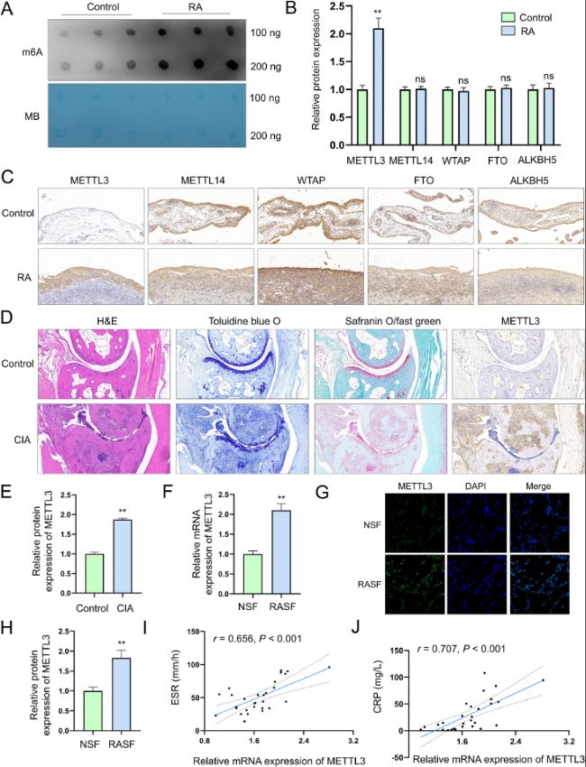 為全面了解METTL3在RA中的作用,研究人員還比較了RA患者滑膜成纖維細(xì)胞(RASFs)和正常滑膜成纖維細(xì)胞(NSFs)中METTL3的表達(dá)水平。結(jié)果顯示,無論是mRNA水平還是蛋白水平,METTL3在RASFs中的表達(dá)均顯著高于NSFs(圖1F-H)。此外,RA患者的滑膜中METTL3蛋白水平與紅細(xì)胞沉降率(ESR)和C反應(yīng)蛋白(CRP)水平呈正相關(guān)(圖1I-J)。這些結(jié)果表明,METTL3在RA的發(fā)病機(jī)制中可能存在關(guān)鍵作用。
