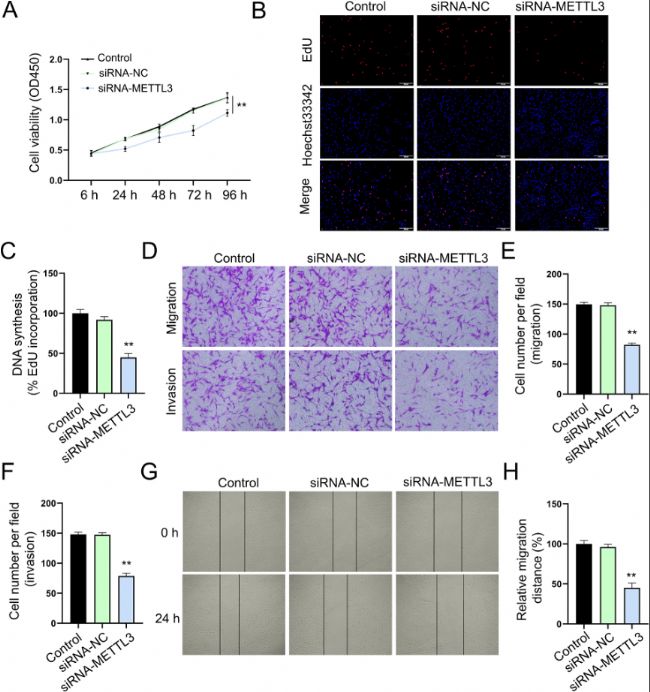 通過siRNA技術(shù)敲低METTL3后,RASFs的增殖能力顯著降低,如CCK-8和EdU實(shí)驗(yàn)所示(圖2A-C)。此外,METTL3敲低還抑制RASFs的遷移和侵襲能力,通過Transwell實(shí)驗(yàn)和創(chuàng)傷愈合實(shí)驗(yàn)進(jìn)一步驗(yàn)證(圖2D-H)。這些結(jié)果表明,METTL3在RASFs的腫瘤樣特性中發(fā)揮重要作用。