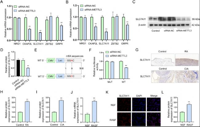 通過m6A測序(m6A-seq)和RNA測序(RNA-seq)技術(shù),研究人員對METTL3敲低的RASFs進(jìn)行了全面的多組學(xué)分析。分析結(jié)果揭示,METTL3敲低的RASFs中SLC7A11 mRNA的m6A修飾顯著減少(圖3B)。SLC7A11蛋白水平在METTL3敲低后也顯著降低(圖3C-D)。此外,通過雙熒光素酶報(bào)告基因?qū)嶒?yàn)驗(yàn)證了METTL3對SLC7A11 mRNA的m6A修飾作用(圖3E-F)。這些結(jié)果表明,METTL3通過m6A修飾調(diào)控SLC7A11 mRNA的穩(wěn)定性。