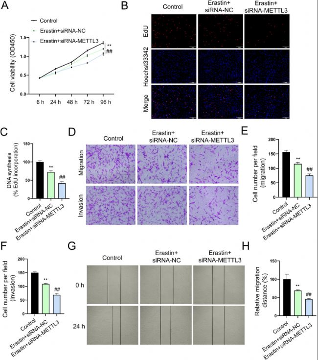 在RASFs中,METTL3敲低加速了erastin誘導(dǎo)的鐵死亡,表現(xiàn)為線粒體膜電位降低、GSH水平下降、MDA水平升高以及ROS水平增加(圖4A-E)。此外,METTL3敲低進(jìn)一步抑制erastin處理的RASFs腫瘤樣特性,如增殖、遷移和侵襲能力的降低(圖5A-H)。這些結(jié)果表明,METTL3通過調(diào)控鐵死亡促進(jìn)RASFs的腫瘤樣特性。
