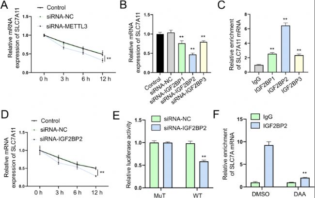 (F) RIP分析揭示在DAA抑制SLC7A11的m6A甲基化后,SLC7A11與IGF2BP2的結(jié)合。