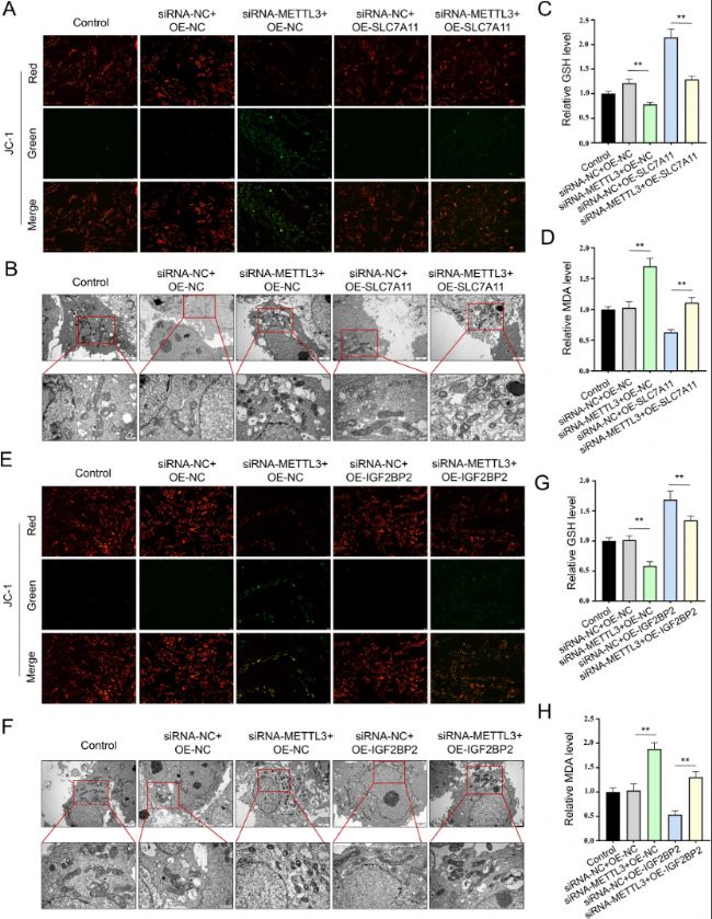 SLC7A11或IGF2BP2過表達(dá)部分抵消了METTL3敲低對erastin誘導(dǎo)的鐵死亡的影響,表現(xiàn)為線粒體膜電位和GSH水平的增加,以及MDA水平的降低(圖7A-D)。這些結(jié)果進(jìn)一步證實(shí)了SLC7A11和IGF2BP2在METTL3調(diào)控鐵死亡中的重要作用。