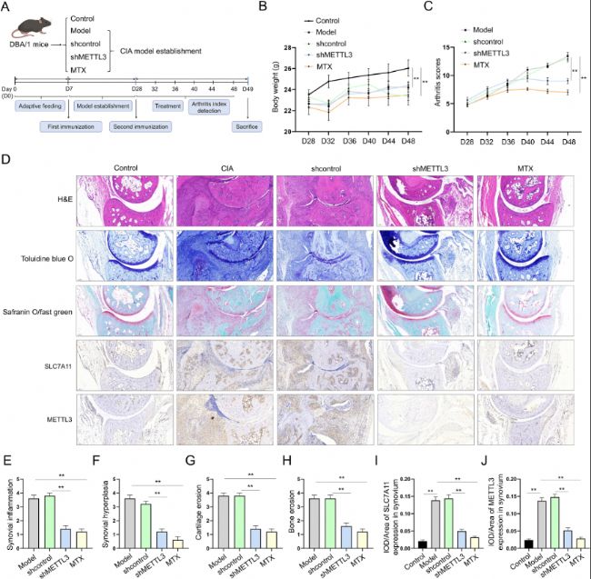 (D) 關(guān)節(jié)的H&E染色、甲苯胺藍(lán)染色(toluidine blue)、番紅O-固綠染色以及SLC7A11和METTL3免疫組化代表性圖像。