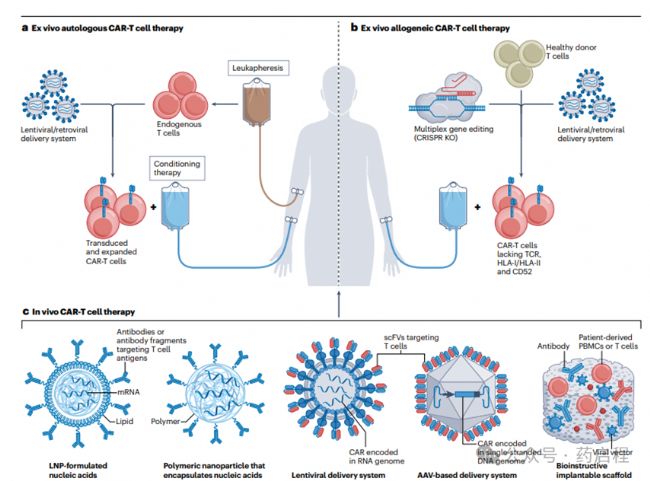 圖 1 | 體外自體和同種異體 CAR-T 細(xì)胞療法與體內(nèi) CAR-T 細(xì)胞療法概覽(2)為克服自體 CAR-T 的生產(chǎn)難題,多種策略已被提出。其中最具前景的是“即用型”同種異體 CAR 工程細(xì)胞產(chǎn)品:從健康供者獲取細(xì)胞,經(jīng)工程改造后制成可凍存的通用庫存(圖 1b)。其優(yōu)點(diǎn)包括產(chǎn)品可立即使用、制造工藝標(biāo)準(zhǔn)化、細(xì)胞改造時(shí)間充裕,并通過工業(yè)化流程降低成本。然而,同種異體CAR-T存在致命的移植物抗宿主。℅vHD)風(fēng)險(xiǎn)。雖然已有緩解策略在開發(fā),但仍需淋巴細(xì)胞清除以防止宿主排斥,而清淋常伴隨長(zhǎng)期血細(xì)胞減少、中性粒細(xì)胞缺乏及反復(fù)感染。因此,亟需全新策略,在保持高效殺瘤活性的同時(shí)降低制造復(fù)雜度和成本。