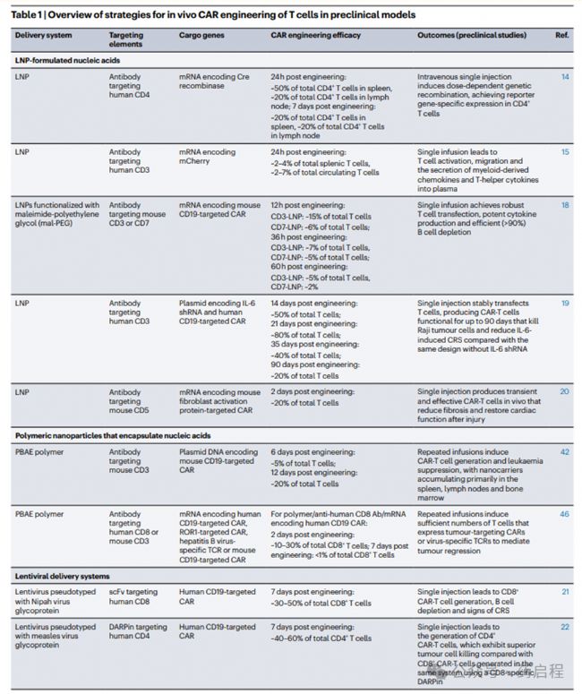 目前多數(shù)借助 LNP 在體內(nèi)制備 CAR-T 細(xì)胞的研究,均在納米顆粒中摻入可識(shí)別 CD3、CD4、CD5、CD7 或 CD8 的抗體或單鏈可變片段(scFv)。
