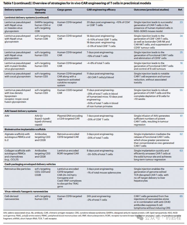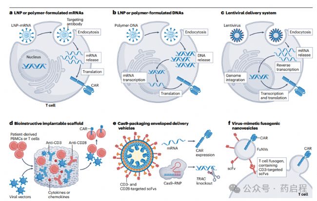 圖 2 | T 細(xì)胞體內(nèi) CAR 工程的現(xiàn)有策略及作用機(jī)制