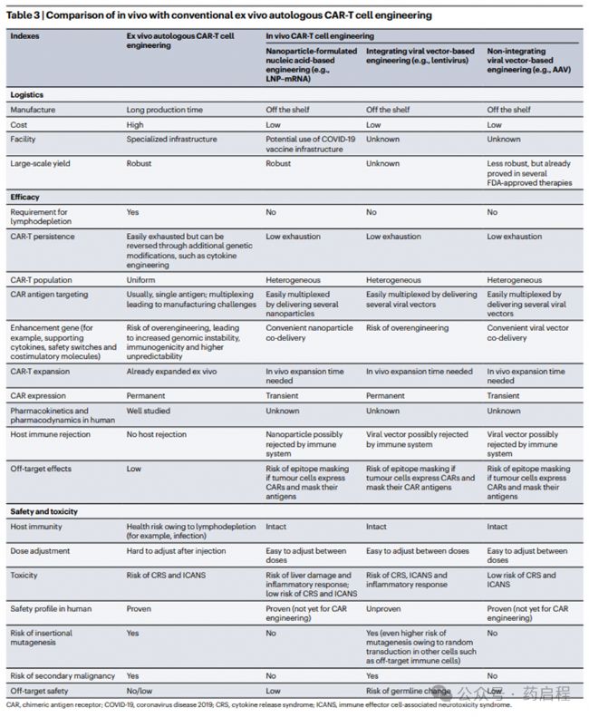 體內(nèi)或體外每種途徑各有優(yōu)勢(shì),也面臨獨(dú)特挑戰(zhàn),涉及生產(chǎn)物流、療效及安全/毒性考量(表 3)。以下從三方面系統(tǒng)比較。