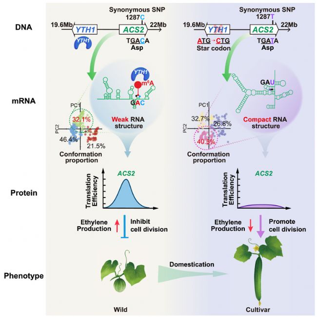 本研究通過 m6A-seq 等技術揭示了黃瓜果實長度馴化的遺傳機制,證明了ACS2基因中的1287位C>T同義突變通過改變m6A修飾和mRNA結(jié)構(gòu)調(diào)控ACS2蛋白的翻譯效率,進而影響果實長度。