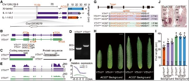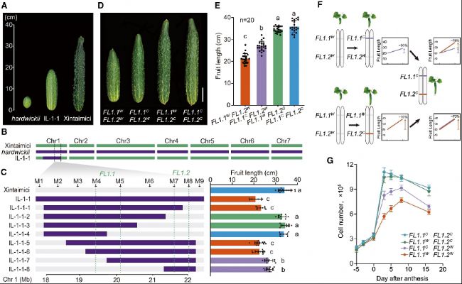 - 遺傳定位與基因克隆:利用野生黃瓜(hardwickii)和栽培黃瓜(Xintaimici)構(gòu)建回交導入系(introgression lines,ILs),通過精細定位將調(diào)控果實長度的FL1位點細分為FL1.1和FL1.2兩個緊密連鎖的基因位點,并進一步克隆出這兩個位點的關鍵基因YTH1和ACS2。