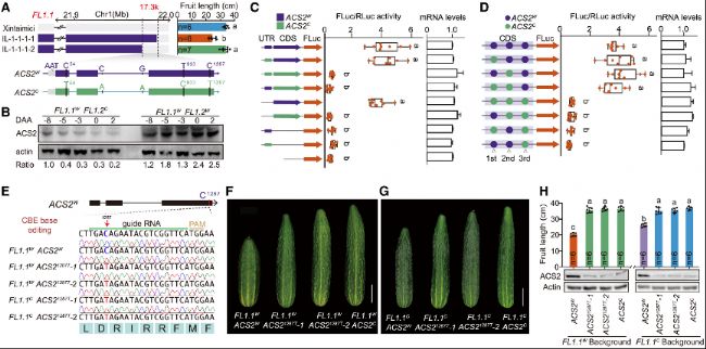 研究團隊將FL1.2定位到17.3kb區(qū)間,發(fā)現(xiàn)該區(qū)間僅含ACS2基因。ACS2編碼1-氨基環(huán)丙烷-1-羧酸合成酶,是乙烯合成的限速酶。基因組測序顯示,野生黃瓜和栽培黃瓜的ACS2存在多個變異,但只有1287位C>T同義突變顯著影響ACS2蛋白水平。通過雙熒光素酶實驗和轉(zhuǎn)基因?qū)嶒烌炞C,1287位C>T同義突變降低了ACS2蛋白水平,進而導致黃瓜果實變長,是FL1.2調(diào)控黃瓜果實長度馴化的因果突變。