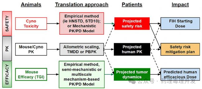 ADC開發是一項多學科的工作,需要將非臨床安全性、藥理學和PK/PD建模戰略性地整合在一起,以成功地從實驗室轉化為臨床應用。ADC開發所涉及的復雜性強調了對強大藥理學和疾病理解的需求,借助先進的分析和建模工具來預測人類反應并優化治療結果。本文旨在提供一個ADC 的PK/PD轉化框架(如下圖所示)。