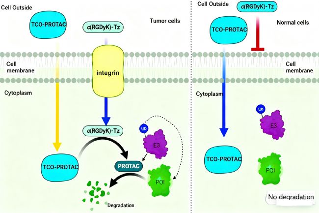 具體而言,研究團隊合成了兩種惰性前藥形式:TCO-ARV-771 和 TCO-DT2216。它們通過在PROTAC分子上引入反式環辛烯(TCO)保護基團,阻斷其與E3泛素連接酶及目標蛋白的正常結合,從而避免在非靶區域激活。當前藥與帶有疊氮苯并環辛炔(Tz)修飾的靶向配體——例如常用于腫瘤靶向的c(RGDyK)肽——相遇時,TCO與Tz發生IEDDA反應,原位釋放出具有活性的PROTAC分子,實現精準的靶點激活和蛋白降解。