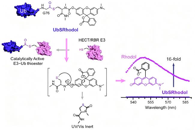 近期,《Angewandte Chemie International Edition》報道了一種開創性的遺傳編碼型前熒光探針——UbSRhodol,可用于實時、定量檢測依賴于半胱氨酸的E3連接酶活性。該探針巧妙地將泛素(Ub)的C端通過氨基甲酸酯鍵連接至掩蔽狀態的羅丹明熒光團,形成硫酯中間體模擬物。在自然狀態下,羅丹明以內酯形式存在,幾乎無熒光;而當E3連接酶催化半胱氨酸攻擊該硫酯鍵時,會發生轉硫酯化反應,生成E3~Ub共價復合物,并同時釋放出游離的羅丹明,恢復強烈熒光信號。