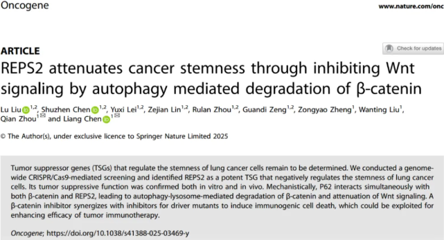 調(diào)節(jié)肺癌細胞干性的腫瘤抑癌基因(TSG)仍有待確定。作者利用CRISPR/Cas9介導的全基因組規(guī)模的關(guān)于肺癌干性基因的篩選,并確定REPS2是一種有效的TSG,對肺癌細胞的干性進行負調(diào)控。其抑癌作用在體外和體內(nèi)都得到了證實。從機制上講,P62同時與β-catenin和REPS2相互作用,導致自噬溶酶體介導的β-catenin的降解從而抑制Wnt信號傳導。β-catenin的抑制劑與驅(qū)動突變抑制劑協(xié)同誘導免疫原性細胞死亡,可用于提高腫瘤免疫治療的療效。
