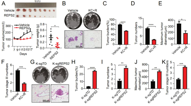 圖4 REPS2在體內(nèi)肺癌小鼠模型中是一種有效的腫瘤抑制因子。A. REPS2過表達對LLC異種移植物腫瘤的影響。腫瘤體積和腫瘤重量統(tǒng)計如下。B.REPS2過表達對轉(zhuǎn)基因小鼠原位肺腫瘤形成的影響。相應(yīng)的HE分析圖像如下所示。C-F.腫瘤負荷、腫瘤數(shù)量、最大腫瘤大小和腫瘤III期數(shù)量的統(tǒng)計數(shù)據(jù)。G.敲除REPS2對Lsl-KrasG12D小鼠腫瘤形成的影響。相應(yīng)的HE分析圖像如下所示。H-K腫瘤負荷、腫瘤數(shù)量、最大腫瘤大小和腫瘤III期數(shù)量的統(tǒng)計數(shù)據(jù)。