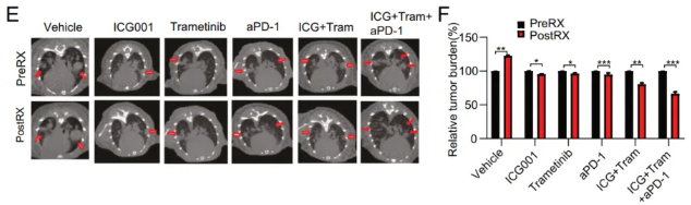 將含有Cre和Cas9的慢病毒注入6-8周齡的LSLKRASG12D雌性小鼠的肺部。感染后6個月,通過CT監(jiān)測REPS2基因敲除小鼠(K-sgREPS2小鼠)和TdTomato基因敲除鼠(K-sgTD小鼠作為對照)的腫瘤負荷。對于K-sgREPS2小鼠治療,將小鼠隨機分為幾組,每組4只。用ICG001(腹膜內(nèi)注射,25mg/kg/天)、曲美替尼(強飼,1mg/kg/天)和PD-1抗體(腹膜內(nèi)注入,5mg/kg/天)治療小鼠2周。通過計算機斷層掃描監(jiān)測腫瘤負荷。