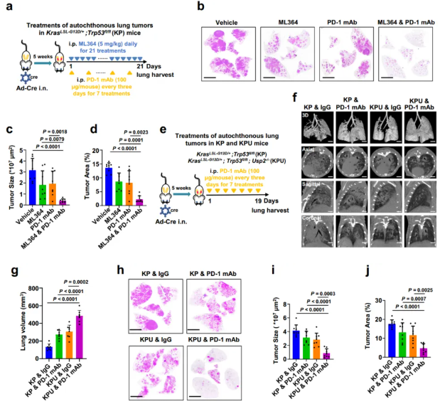為了進(jìn)一步研究USP2抑制在體內(nèi)調(diào)節(jié)抗PD-1免疫治療中的作用,作者使用了基因工程的KrasLSL-G12D/+;Trp53fl/fl(KP)小鼠腫瘤模型,在鼻內(nèi)滴注表達(dá)Cre重組酶的腺病毒(Ad-Cre),誘導(dǎo)其形成原位肺腫瘤。攜帶肺腫瘤的KP小鼠接受ML364單藥,抗PD-1單克隆抗體單藥或聯(lián)合腹腔注射治療(圖7a)。與同基因小鼠LLC腫瘤模型的結(jié)果一致(圖4),與ML364或抗PD-1抗體單一療法相比,聯(lián)合治療顯著抑制了KP小鼠的腫瘤發(fā)展,具體表現(xiàn)為腫瘤面積的減小和腫瘤面積占全肺面積比例的減小(圖7b-d)。