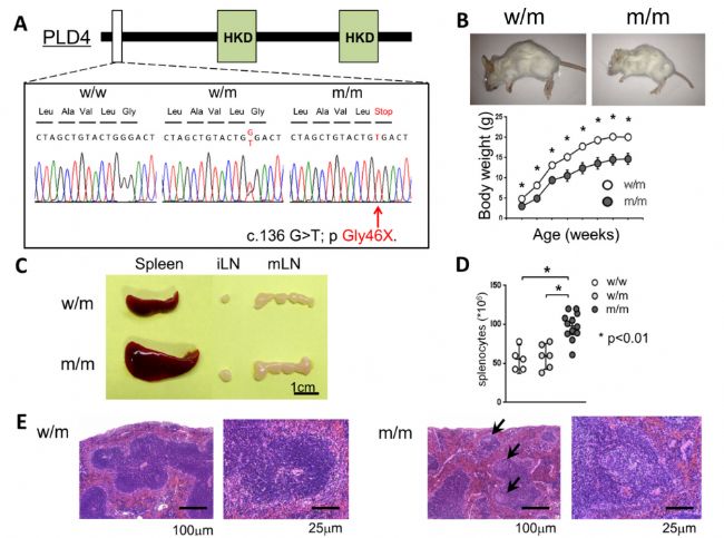 已有研究表明,Pld4基因敲除小鼠會出現一系列自身免疫表型,包括體重減輕、脾臟腫大、自身抗體增加和免疫復合物沉積。此外,同時缺失Pld4及其家族成員Pld3的小鼠會在幼年期死亡。盡管Pld4缺陷小鼠會出現自身免疫表型,但PLD4基因突變導致的人類疾病尚未見報道。