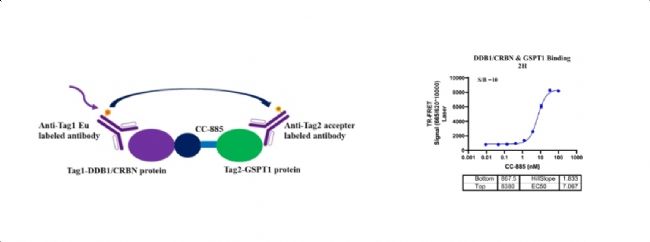 CC-885是一種新型的cereblon分子膠調(diào)節(jié)劑,它通過與cereblon (CRBN) 結(jié)合,利用CRL4CRBN E3泛素連接酶的功能,發(fā)揮抗腫瘤活性。其主要靶點(diǎn)是翻譯終止因子GSPT1,CC-885能夠促進(jìn)GSPT1的CRBN依賴性泛素化和降解,從而在患者來源的急性髓系白血病腫瘤細(xì)胞中表現(xiàn)出高度敏感性,顯示出其臨床潛力。該實(shí)驗(yàn)用Europium-labeled Tag1和Acceptor-labeled Tag2檢測(cè)CRBN/DDB1蛋白和GSPT1蛋白通過分子膠CC-885介導(dǎo)的相互作用。