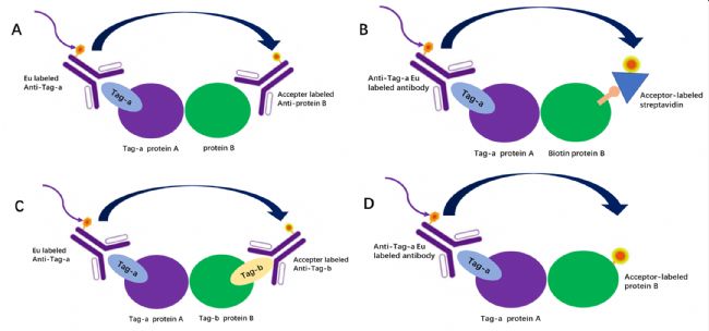圖A,使用帶有供體標(biāo)記的抗標(biāo)簽a抗體結(jié)合蛋白質(zhì)A,并使用帶有受體標(biāo)記的抗蛋白質(zhì)B抗體(定制或用用標(biāo)記試劑標(biāo)記)結(jié)合蛋白質(zhì)B,產(chǎn)生FRET信號(hào)。