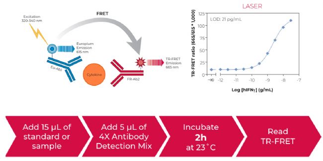 THUNDER細(xì)胞因子檢測(cè)是基于雙抗體夾心法,標(biāo)記熒光供體和受體的IFNγ抗體Eu-Ab1和FR-Ab2,分別與細(xì)胞上清中IFNγ結(jié)合,產(chǎn)生能量共振轉(zhuǎn)移FRET(615nm),進(jìn)而產(chǎn)生665nm熒光信號(hào),熒光信號(hào)強(qiáng)度與IFNγ濃度成正比。全程僅需2h,免洗,可高通量。檢測(cè)靈敏度高,上限寬。