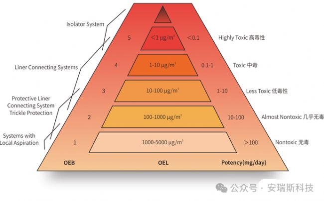 中國醫(yī)藥企業(yè)管理協(xié)會(huì)制定的《中國制藥工業(yè)EHS指南》。該EHS指南指出:制藥行業(yè)通常在藥物生產(chǎn)過程中會(huì)涉及到具有一定活性、毒性、致敏性和致畸性的藥物或其中間體,其職業(yè)接觸限值(OEL)通常低于1mg/m3,或尚未有公開的可信的接觸限值。企業(yè)需要建立獲取藥物或其中間體OEL的途徑和方法,并采用藥物分級(jí)管理制度。OEB 往往分為5級(jí):