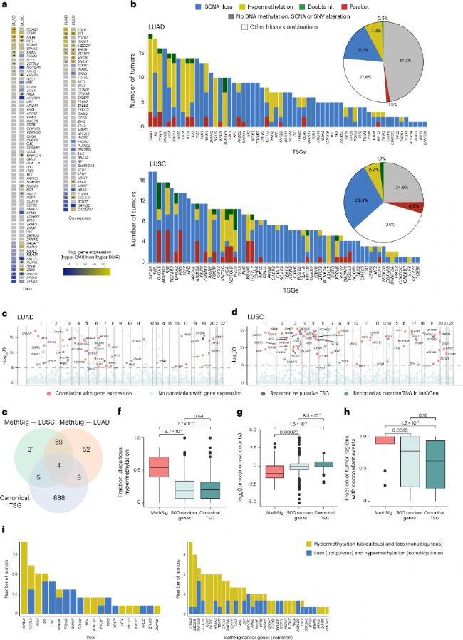 b. LUAD和LUSC腫瘤中基因組TSGs的拷貝數丟失(藍色)或啟動子高甲基化(黃色)數量。并行事件定義為在同一腫瘤的不同區域發生啟動子高甲基化和拷貝數丟失(紅色)。雙重打擊事件定義為在同一區域發生啟動子高甲基化和拷貝數丟失的腫瘤(綠色)。其他事件組合包括拷貝數增加、突變或啟動子低甲基化及其組合(白色)。餅圖總結了所有基因組TSGs中每種事件類型比例。