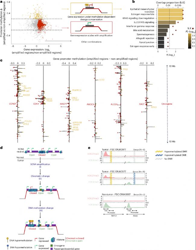 - 基因在擴增與未擴增時啟動子甲基化中位數的差異(y軸)。大于0.2的值表示基因在擴增時DNA甲基化增加。x軸表示基因在擴增區域與未擴增區域之間表達量比率。正值表示基因表達與拷貝數擴增成正比。黃色突出顯示基因可能處于DNA甲基化依賴的劑量補償之下,因為其甲基化水平與拷貝數成正比。紅色突出顯示的基因的表達水平與拷貝數成正比,但與DNA甲基化不成正比。