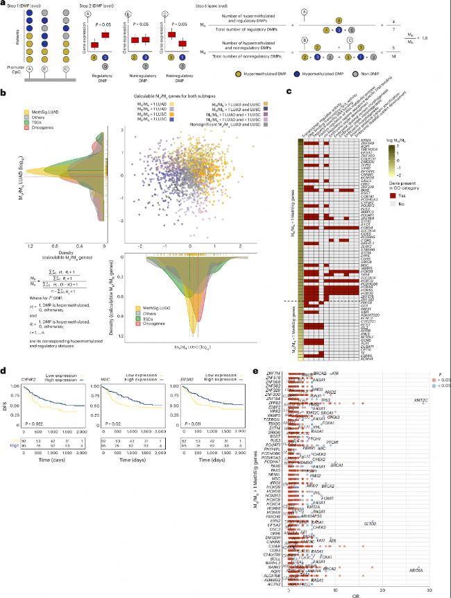 a. 分別靶向肺腺癌(LUAD)和肺鱗癌(LUSC)的基因組抑癌基因(TSGs,左側)和原癌基因(右側),啟動子差異甲基化區域(DMR)狀態對基因表達的影響。負值表示在基因啟動子高甲基化(黃色)的樣本中表達降低;正值表示在基因啟動子高甲基化(藍色)時表達增加。