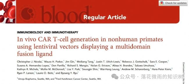 這是2024年8月份發表在blood的一篇文章:In vivo CAR T-cell generation in nonhuman primates using lentiviral vectors displaying a multidomain fusion ligand. 雖然這不是最新的文獻,但是VivoVec是Umoja Biopharma開發的慢病毒遞送系統,所以這篇文獻還是值得學習一下的。說起來,這是解讀的第二篇,第一篇詳見:文獻閱讀[1]-CAR T cells produced in vivo to treat cardiac injury